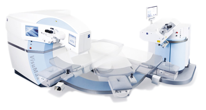 Un premier laser est donc utilisé pour découper le volet cornéen : le laser femtoseconde (Visumax Zeiss).
